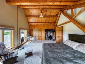 The home’s craftsmanship continues upstairs, where both bedrooms feature vaulted ceilings and exposed wood accents. These architectural details amplify the sense of openness while maintaining the cozy charm that defines log construction. The natural wood finishes create a calming retreat-like ambiance in each bedroom, making them ideal spaces to unwind at the end of the day. The vaulted design allows for additional vertical space, enhancing both comfort and visual appeal.