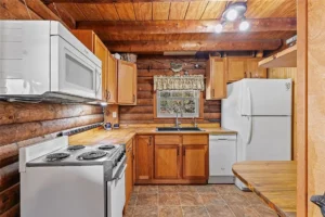 The kitchen has been thoughtfully updated to support modern living while maintaining the cabin’s cozy charm. Renovated in 2020, the kitchen features new cabinets, countertops, and a new refrigerator. These updates improve both functionality and appearance, creating a space that is well-suited for everyday meals as well as entertaining. The layout allows for efficient use of space, making cooking and gathering enjoyable and practical.