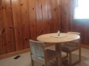 The living areas are cozy yet spacious, providing plenty of room to relax after a long day spent outdoors. Large windows allow natural light to pour inside, brightening the interior while framing beautiful views of the surrounding land. During cooler months, the home becomes an especially inviting place to unwind, offering a warm and comfortable retreat from the crisp mountain air.