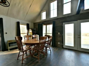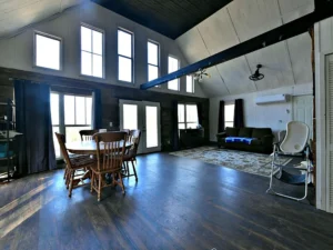 The living room is designed to feel open, comfortable, and welcoming. Soaring ceilings create a sense of spaciousness, while natural wood accents add warmth and rustic charm. The room becomes the heart of the home—a place where family and friends gather to relax, share stories, and enjoy the peaceful surroundings. Whether you are spending a quiet evening watching the sunset through the windows or entertaining guests for a weekend gathering, the living room provides the perfect setting.