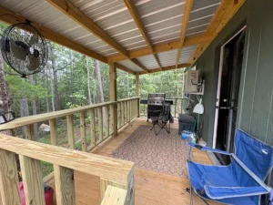 Outdoor living is a major highlight of this property. The cabin features both a covered 8×16 front porch and a covered 8×16 back deck, providing ample space to relax and enjoy the surrounding wilderness. These covered areas allow you to sit outside in comfort, whether you’re watching wildlife, listening to the forest sounds, or enjoying the changing seasons. Morning coffee, evening meals, or quiet moments of reflection are all elevated by the peaceful outdoor setting.