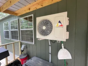 The cabin itself has been carefully constructed to balance rustic charm with modern efficiency. With one bedroom and one full bathroom, the layout is compact yet highly functional, making excellent use of every square foot. The cabin is heated and cooled with a mini split system, providing year-round comfort regardless of the season. Whether you’re visiting during the heat of summer or the cooler mountain months, the interior remains comfortable and inviting.