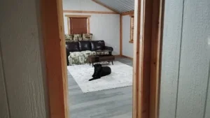 Throughout the cabin, vinyl flooring provides durability and ease of maintenance while complementing the natural, wood-focused design. The interior showcases custom-built wood doors, adding warmth, character, and craftsmanship that elevate the space beyond a standard cabin. Each detail reflects intentional design choices made to create a cozy yet practical environment.