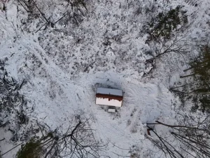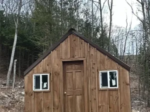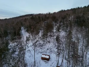 At the heart of the property sits a fully insulated rustic cabin that serves as a cozy and functional basecamp. Simple yet welcoming, the cabin offers a warm refuge after a day spent outdoors. A wood-burning stove provides heat and ambiance, creating the classic camp experience that many seek when heading into the woods. The cabin’s insulation enhances comfort across the seasons, making it suitable for extended stays throughout much of the year. An on-site outhouse supports the cabin’s off-grid character while maintaining practicality.