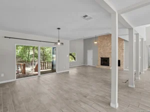 A beautiful fireplace serves as a focal point in the living area, adding both character and practicality to the space. On cooler evenings, the fireplace creates a cozy atmosphere where family members can gather to relax, read, or enjoy quiet conversations. Few features bring a home together quite like a fireplace, and this one adds a welcoming charm that complements the relaxed Hill Country lifestyle.