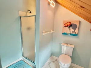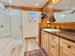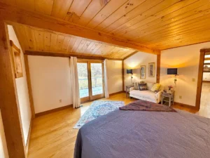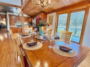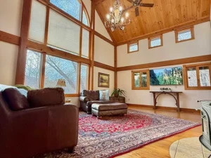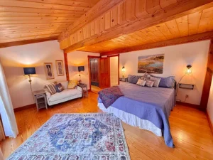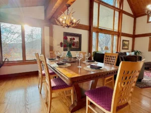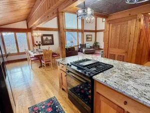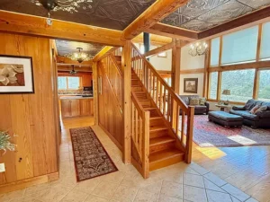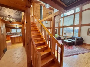 Throughout the main floor, stunning pine flooring enhances the rustic character of the home. The natural tones of the wood create a cozy yet elegant atmosphere that complements the post-and-beam architecture.