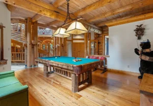 Additional interior spaces include a library, a game room, and a wine cellar, each contributing to the lodge’s sense of completeness and livability. Cozy nooks and well-crafted details throughout the home invite you to linger, unwind, and truly inhabit the space.