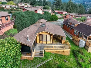 The interior layout is both functional and versatile. This cabin features two bedrooms and two full bathrooms, each located at opposite ends of the home. This design provides maximum privacy, making it ideal for hosting guests, family members, or roommates. Whether you are entertaining visitors or living with someone full-time, everyone can enjoy their own private space. The bedrooms are cozy yet spacious, offering ample room for furniture and storage. Large windows allow natural light to fill the space and further accentuate the stunning ocean views from various vantage points.