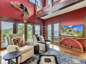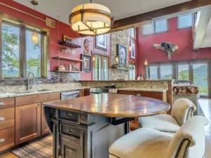 The great room of the home is a showpiece of craftsmanship, warmth, and architectural beauty. Anchored by a towering floor-to-ceiling stone fireplace, this space immediately draws you in with its sense of scale and comfort. Vaulted ceilings, wide-plank wood floors, and expansive windows bring the outdoors inside, framing breathtaking views in every direction. The fireplace becomes the natural gathering point, where evenings are spent sharing stories, laughter, and quiet moments as the fire crackles and the mountains glow in the distance.