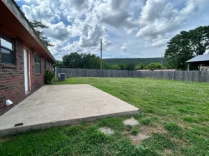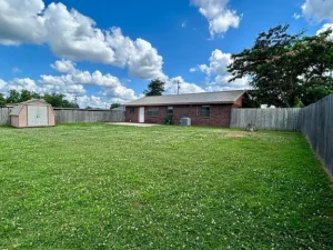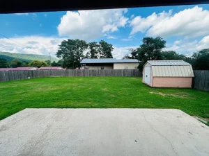 In the back, a patio area provides space for outdoor dining, entertaining, or relaxing. Whether you envision hosting barbecues, setting up outdoor seating, or creating a small garden oasis, this patio offers a great starting point. An outdoor shed adds valuable storage space for tools, lawn equipment, or seasonal items, helping keep the yard and interior organized.